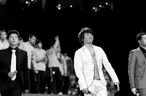 捧場的不是粉絲,而是球迷,于是文藝演出的現(xiàn)場也確實(shí)被渲染出賽場的氣氛。看臺上,有球迷在吼:“國安是冠軍!”更多的球迷隨后被帶動,在坐滿了國安忠實(shí)球迷的區(qū)域里,喊聲震耳欲聾。晚會開場前,大屏幕上首先播放的是10月31日國安隊奪冠比賽的片段。一個多月的時間并沒有沖淡球迷的記憶,隨著一個又一個的進(jìn)球,球迷們的歡呼更加熱烈,依稀讓人重溫當(dāng)天工體的狂熱。