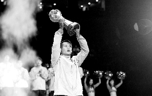 國安隊長徐云龍在晚會上捧起中超冠軍獎杯——火神杯