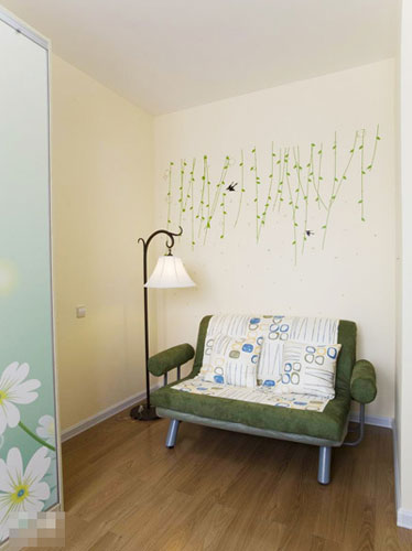 這是書房的一角,與客廳背景墻的“鳥語花香”一樣,這一面背景墻同樣呈現出春意盎然的景象。