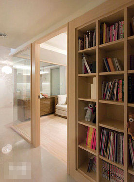 書房界面以清玻璃與公共空間作界定,敞朗而明亮,書柜以嵌入方式與接口切齊規劃,維系立面的完整同時收納機能充裕。
