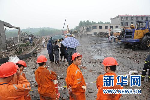 7月8日,幾名救援人員在爆炸現(xiàn)場待命。新華社記者 趙鵬 攝