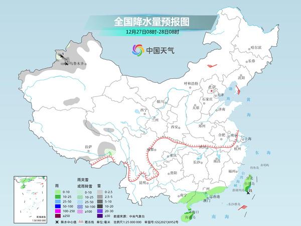 后天,新疆北部和南疆西部山區、西藏東部等地部分地區有小到中雪或雨夾雪,其中,新疆伊犁河谷等地部分地區有大雪。華南南部、海南島、臺灣島等地部分地區有小到中雨,局地有大雨。