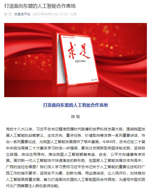 8月1日,《求是》刊發廣西壯族自治區黨委書記、自治區人大常委會主任陳剛署名文章《打造面向東盟的人工智能合作高地》,全文如下——