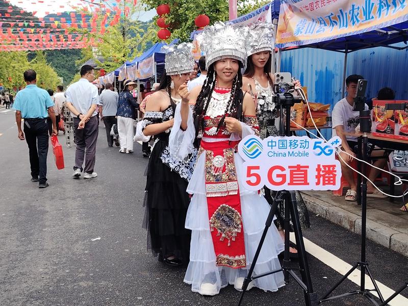 蒙山縣“中國農民豐收節”暨夏宜瑤族鄉經濟社會高質量發展活動中開展5G網絡直播。