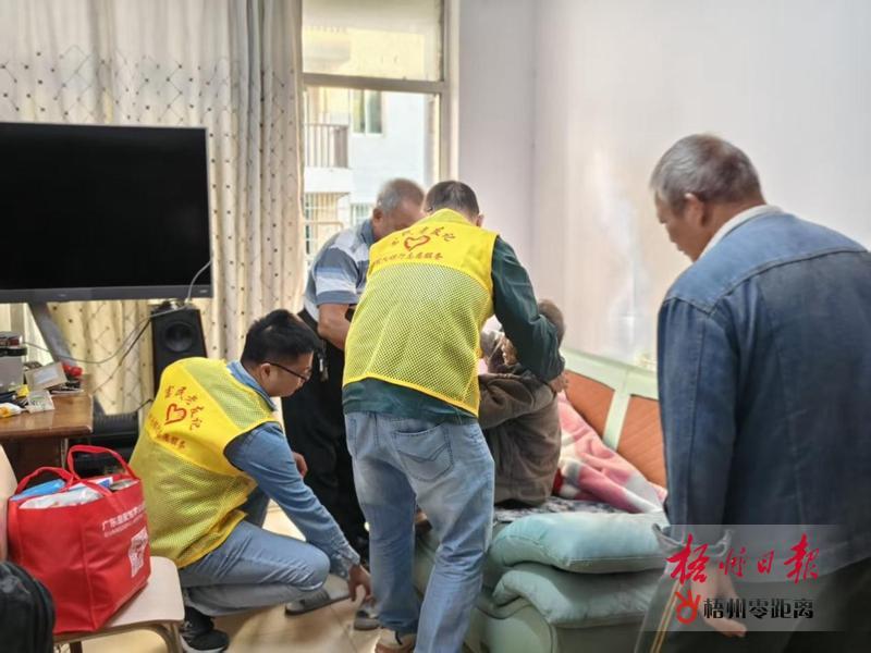 梧州零距離網-梧州日報訊 近日,萬秀區富民街道“富民老友記”時間銀行志愿服務富祥社區分隊開展了一場溫馨的“銀發守護”行動。志愿者將臥病在床、無親屬照料的特困供養人員蒙福新老人,從家中安全護送至萬秀區社會福利院,以實際行動踐行“關愛一老一少·情暖特殊群體”的服務宗旨。