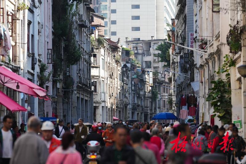 的老建筑群中,街道熙熙攘攘的人群、此起彼伏的叫賣聲,交織成一幅富有生活氣息的畫卷,展示百年騎樓的現(xiàn)代芳華。記者 楊揚(yáng) 攝