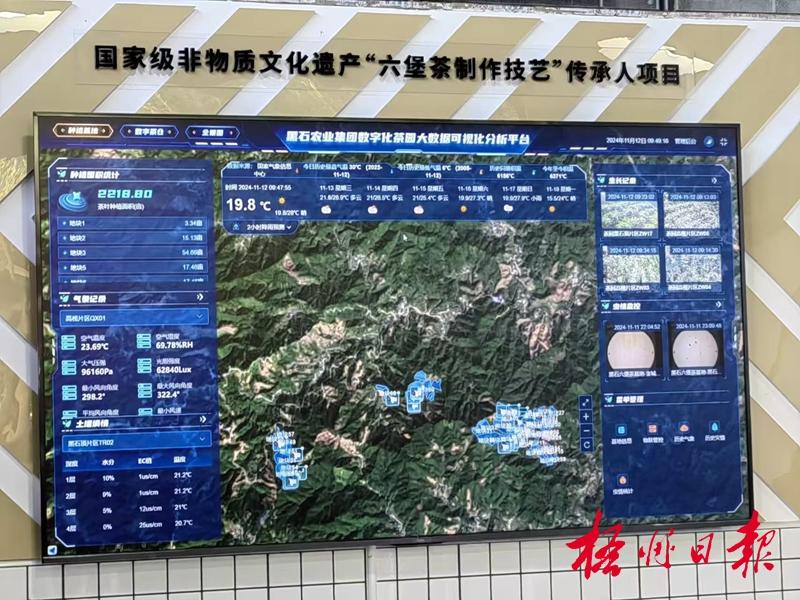在黑石六堡茶源博園內,中央監控大屏屏幕上實時顯示各茶區的溫度、濕度、病蟲害信息等相關情況。 記者 陳益銘 攝
