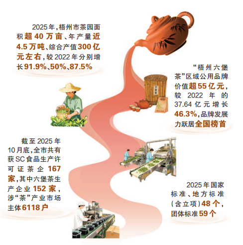 放眼梧州,這份六堡茶產業高質量發展的精彩答卷寫在青山綠水、茶園疊翠里,寫在茶鄉蝶變、茶農增收里,寫在產業提質、品牌躍升里,寫在非遺傳承、茶香遠播中:2025年,全市茶園面積超40萬畝、年產量近4.5萬噸、綜合產值300億元左右,較2022年分別增長91.9%、50%、87.5%;“梧州六堡茶”區域公用品牌價值超55億元,較2022年的37.64億元增長46.3%,品牌發展力躍居全國榜首。