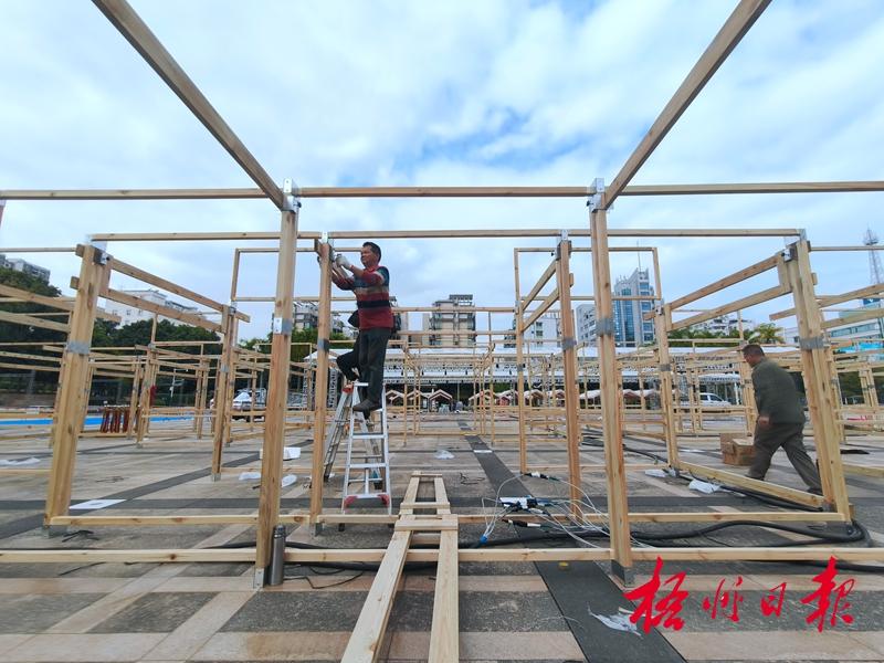 12月16日,在市政廣場,工人正在布置展銷會的場地。